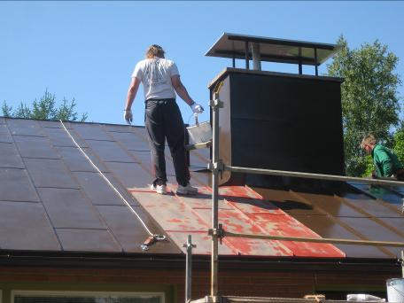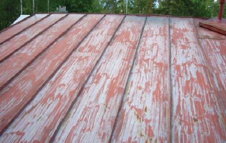 Vanha konesaumattu katto ensimmäisessä kuvassa pestynä ja alemmassa pinnoitettuna. Maalattu käsityönä panssarimaalilla. Värinä vanha kupari. Katto pinnoitettu kesällä 2009 |