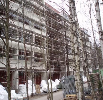 Tampereen Hervannassa kerrostalon peruskorjauksessa Cattel Oy toteutti telineiden rakentamisen